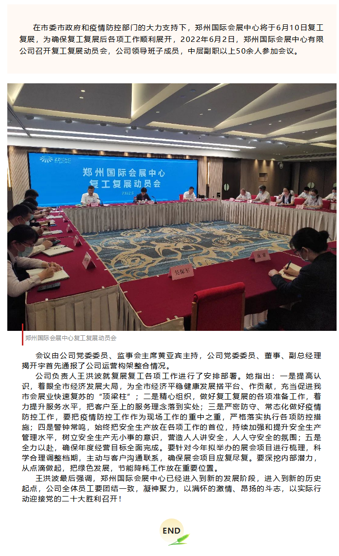 在市委市政府和疫情防控部門的大力支持下,鄭州國際會展中心將于6月10日復工復展,為確保復工復展后各項工作順利展開,2022年6月2日,鄭州國際會展中心有限公司召開復工復展動員會,公司領導班子成員,中層副職以上50余人參加會議。