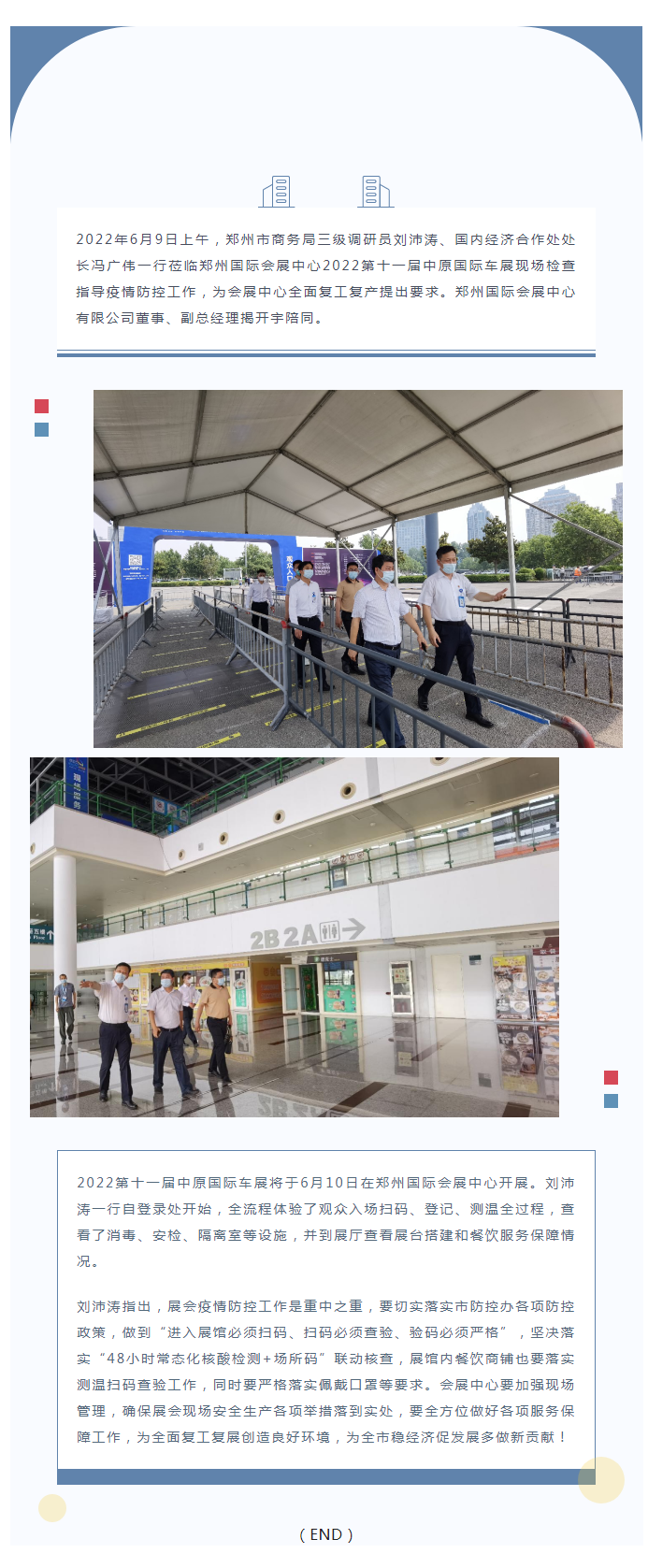 2022年6月9日上午,鄭州市商務(wù)局三級(jí)調(diào)研員劉沛濤、國內(nèi)經(jīng)濟(jì)合作處處長馮廣偉一行蒞臨鄭州國際會(huì)展中心2022第十一屆中原國際車展現(xiàn)場(chǎng)檢查指導(dǎo)疫情防控工作,為會(huì)展中心全面復(fù)工復(fù)產(chǎn)提出要求。鄭州國際會(huì)展中心有限公司董事、副總經(jīng)理揭開宇陪同。
