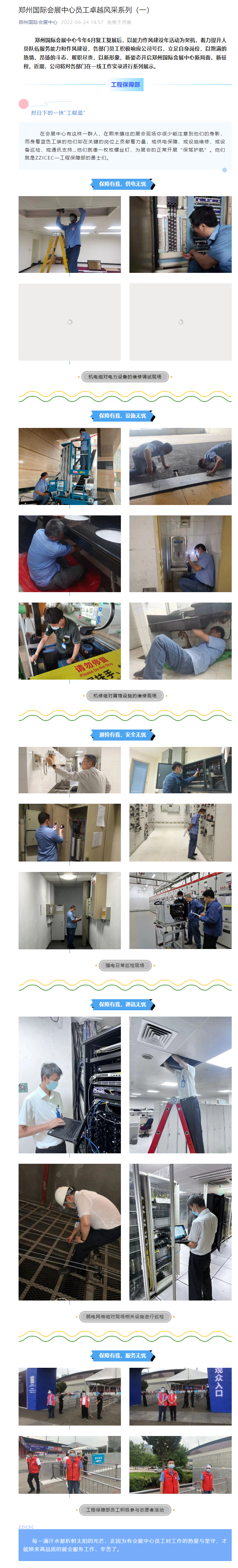首頁新聞中心展會新聞文章詳情 文章詳情 鄭州國際會展中心員工卓越風(fēng)采系列(一) 鄭州國際會展中心今年6月復(fù)工復(fù)展后,以能力作風(fēng)建設(shè)年活動為契機,著力提升人員隊伍服務(wù)能力和作風(fēng)建設(shè),各部門員工積極響應(yīng)公司號召,立足自身崗位,以飽滿的熱情、昂揚的斗志,履職盡責(zé),以新形象、新姿態(tài)開啟鄭州國際會展中心新局面、新征程。近期,公司將對各部門在一線工作實錄進行系列展示。
