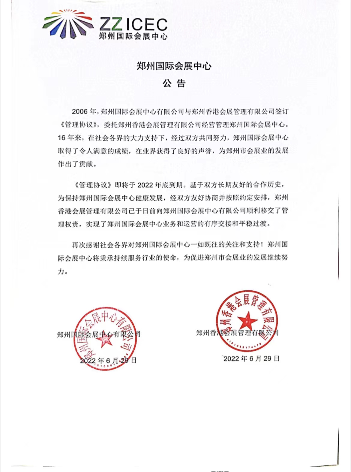 鄭州國(guó)際會(huì)展中心公告