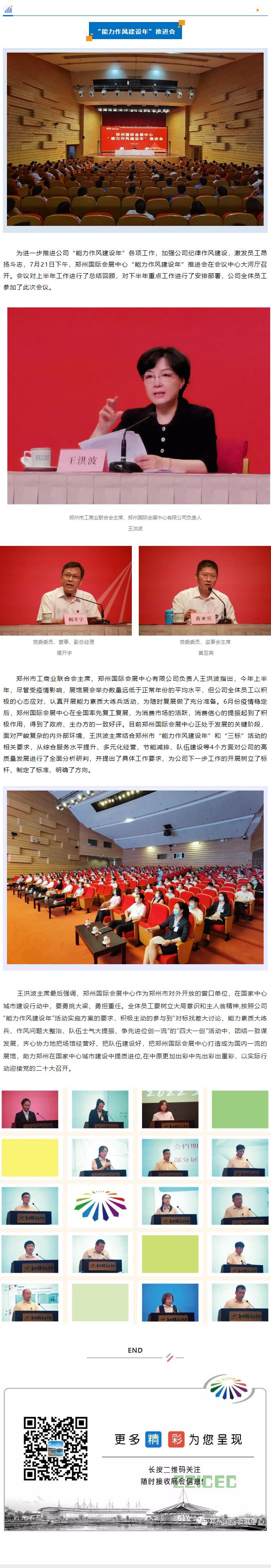 為進(jìn)一步推進(jìn)公司“能力作風(fēng)建設(shè)年”各項(xiàng)工作,加強(qiáng)公司紀(jì)律作風(fēng)建設(shè),激發(fā)員工昂揚(yáng)斗志,7月21日下午,鄭州國(guó)際會(huì)展中心“能力作風(fēng)建設(shè)年”推進(jìn)會(huì)在會(huì)議中心大河廳召開(kāi)。會(huì)議對(duì)上半年工作進(jìn)行了總結(jié)回顧,對(duì)下半年重點(diǎn)工作進(jìn)行了安排部署,公司全體員工參加了此次會(huì)議。