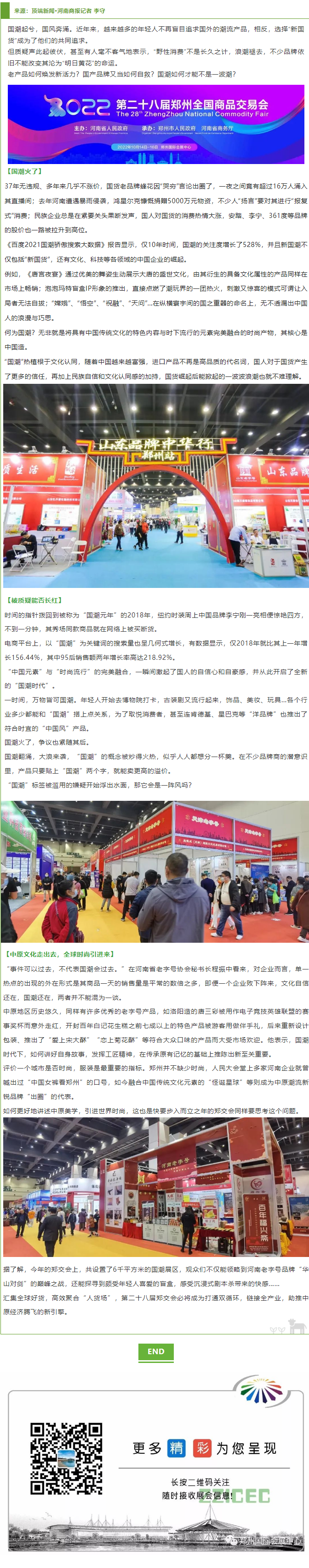 首頁新聞中心展會新聞文章詳情 文章詳情 傳統(tǒng)與潮流碰撞!看鄭交會如何玩轉(zhuǎn)“新國潮” 國潮起兮,國風(fēng)奔涌。近年來,越來越多的年輕人不再盲目追求國外的潮流產(chǎn)品,相反,選擇“新國貨”成為了他們的共同追求。 但質(zhì)疑聲此起彼伏,甚至有人毫不客氣地表示,“野性消費”不是長久之計,浪潮褪去,不少品牌依舊不能改變其淪為“明日黃花”的命運。 老產(chǎn)品如何煥發(fā)新活力?國產(chǎn)品牌又當(dāng)如何自救?國潮如何才能不是一波潮?