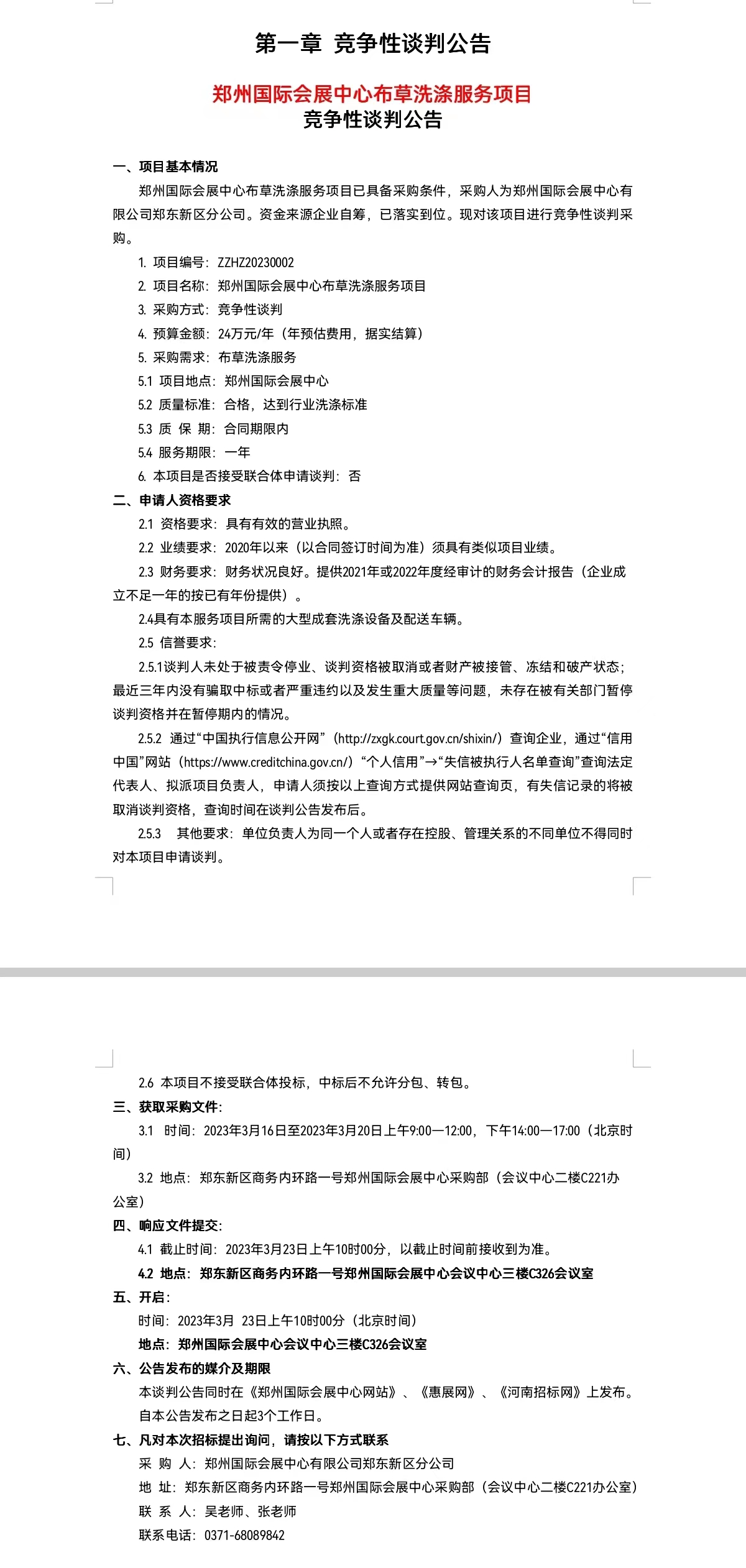 鄭州國際會展中心布草洗滌服務項目 競爭性談判公告